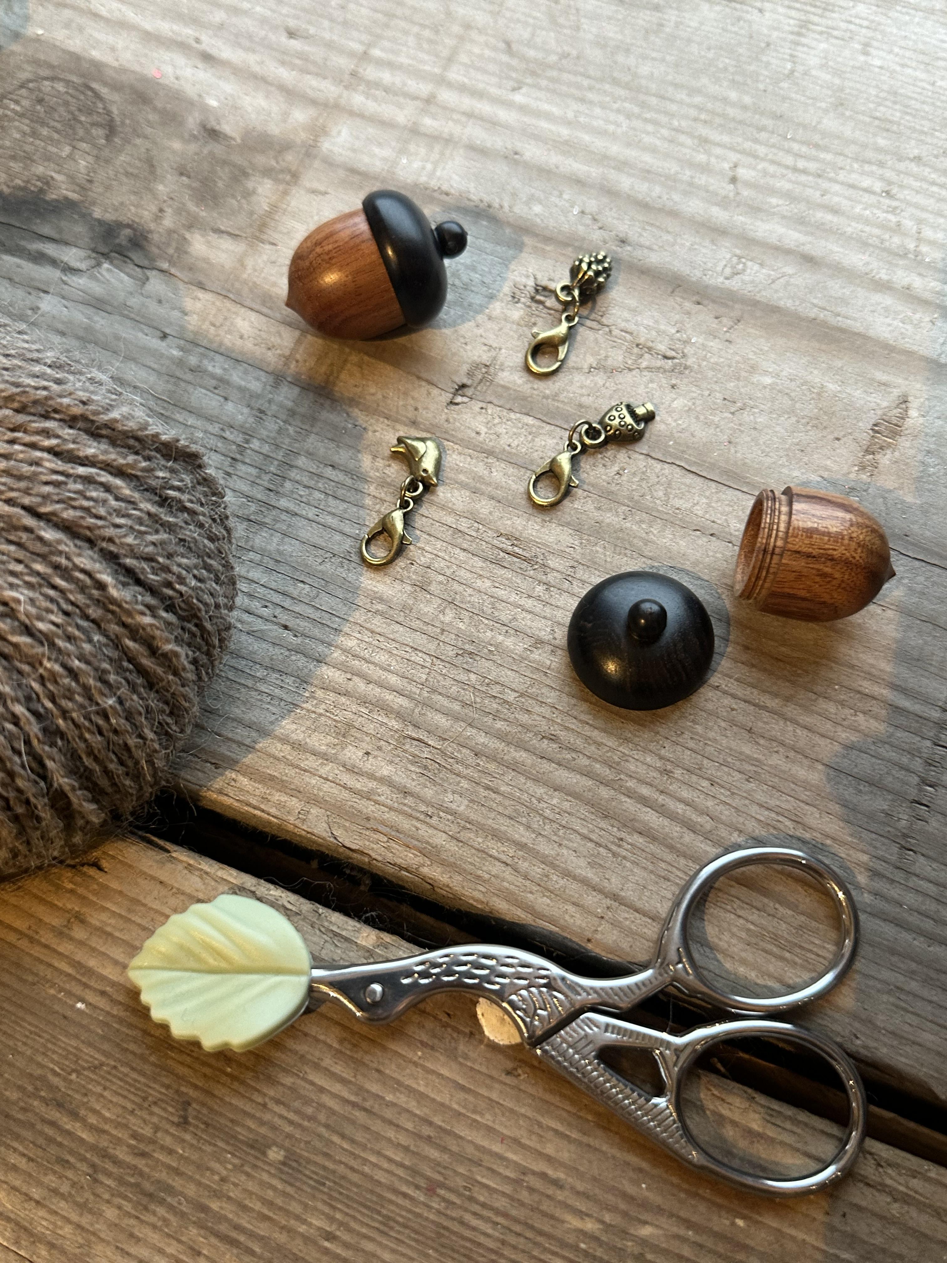 Eikenøtt med tre søte markører oppi i skogens tema.