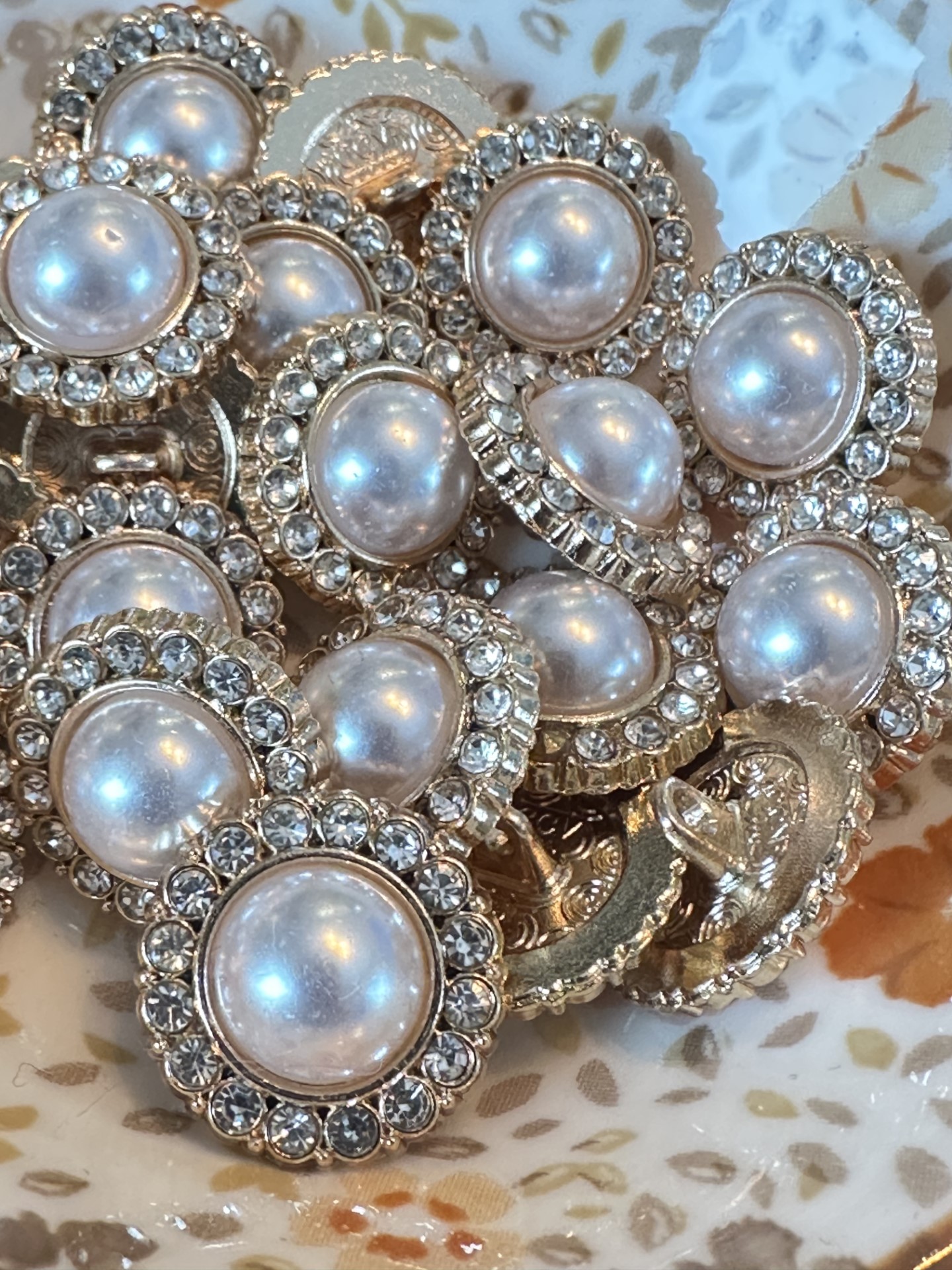 Metall knapp i gull med perle i midten og diamanter rundt , 15mm.