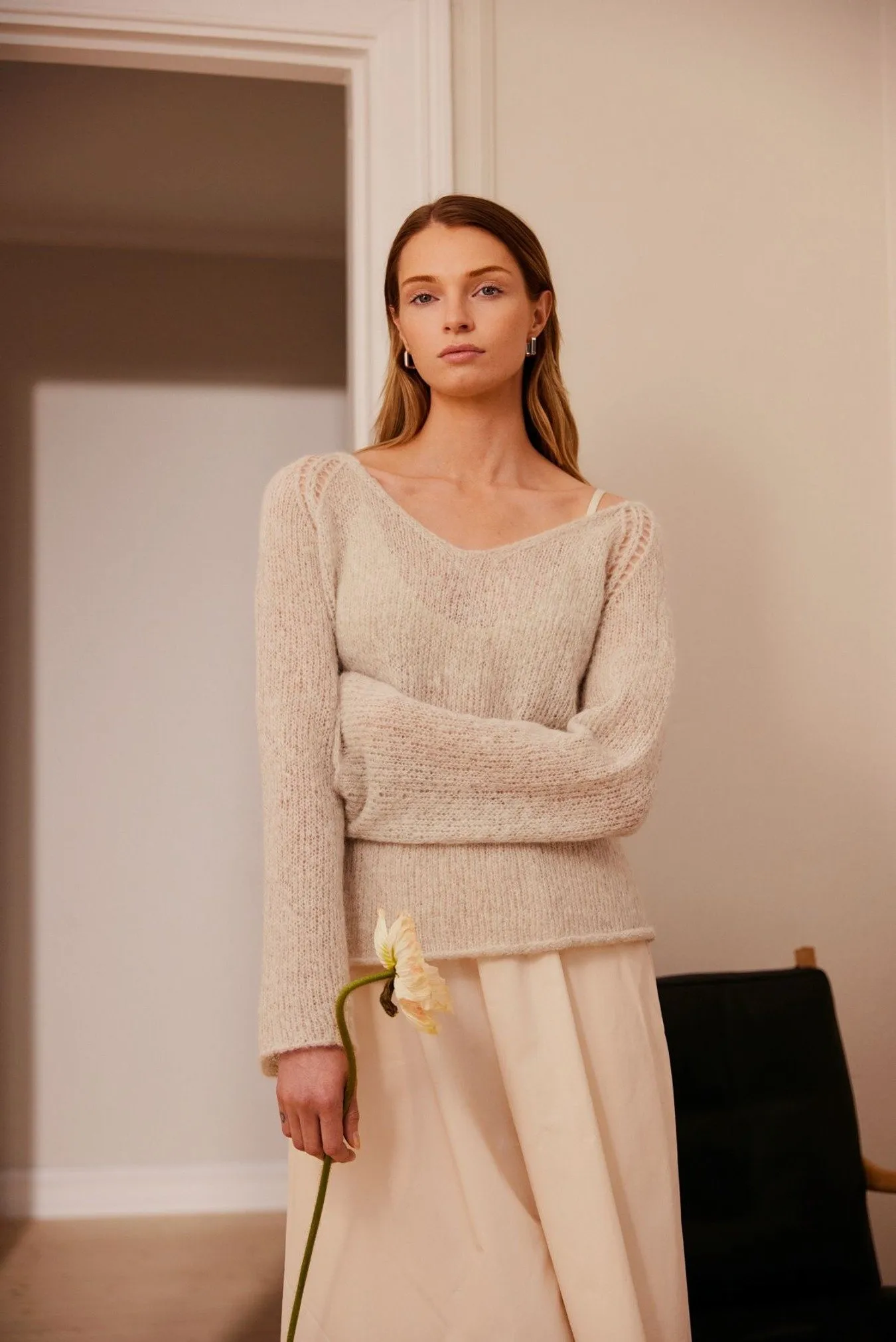 Marianne genser er en glattstrikket enkel genser med v-hals. Den har raglan med en dekorativ hullbord. Genseren har en anelse a-fasong og strikkes nedenfra og opp.