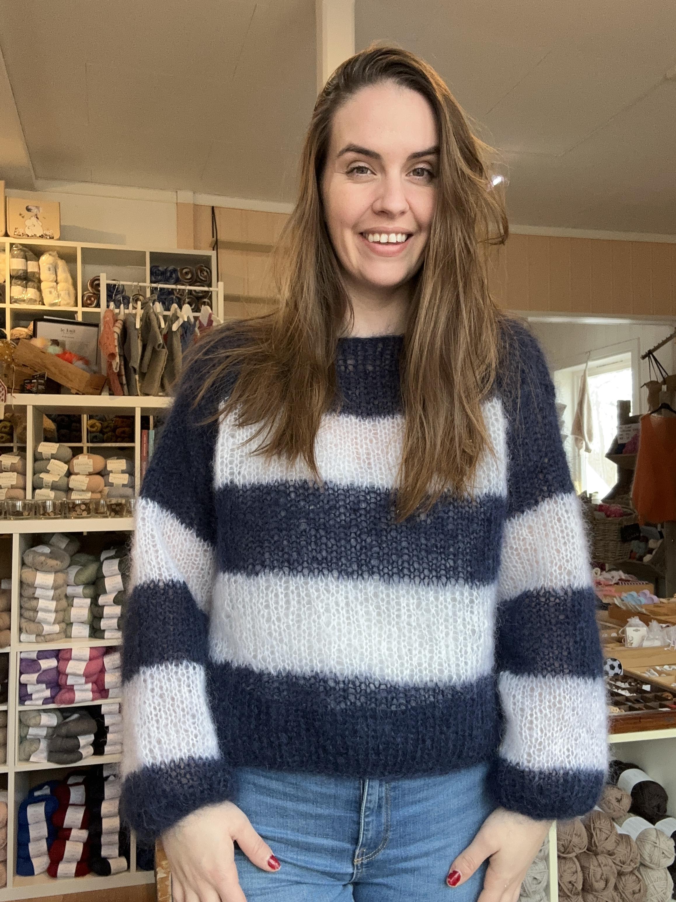 Summer flow Sweater , nydelig stripete genser til sommer dagene. Genseren er strikket i Bella fra Permin,med en tråd på pinne 10mm ( legger opp på. 8mm)