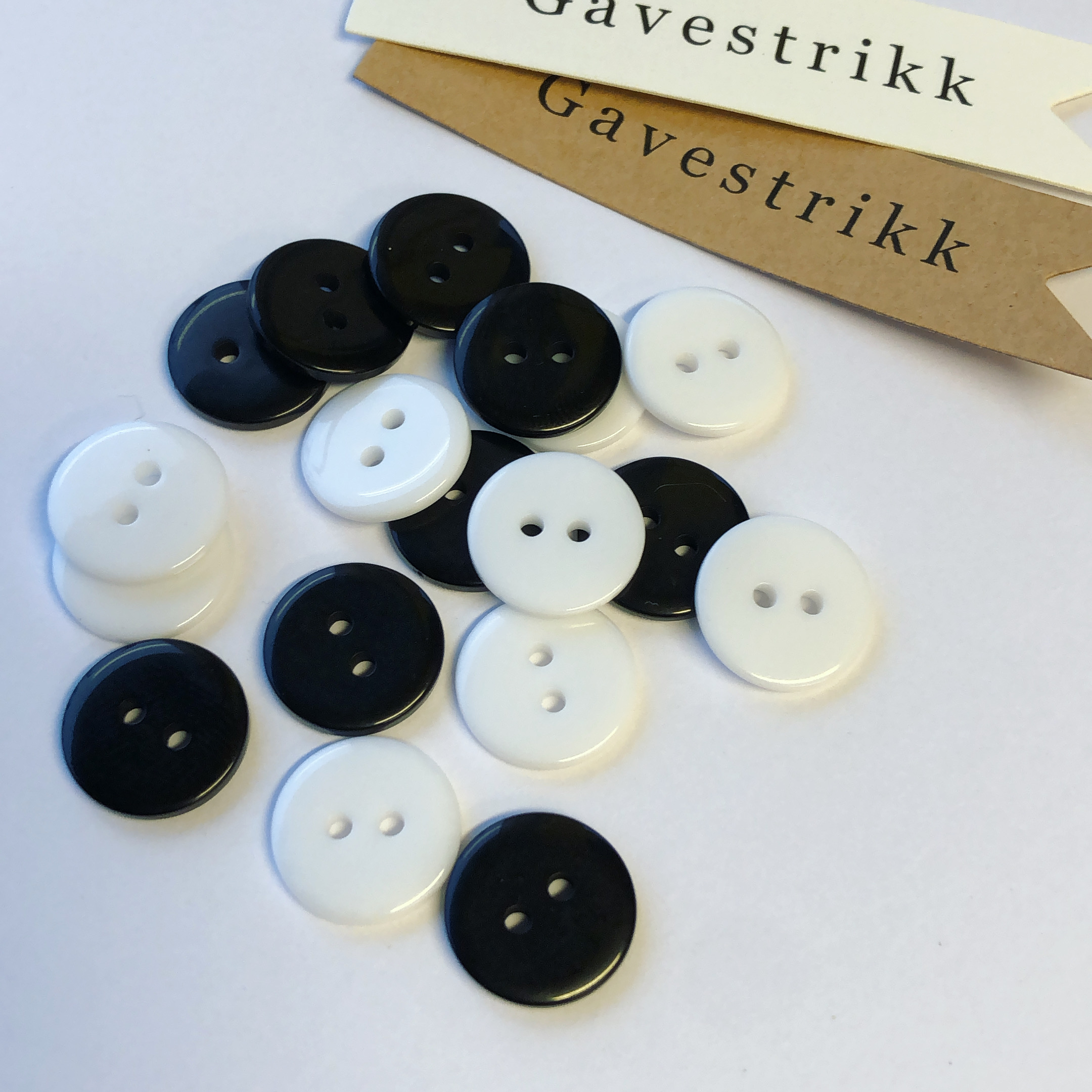 To hulls plast knapp i sort og hvit , 15mm.