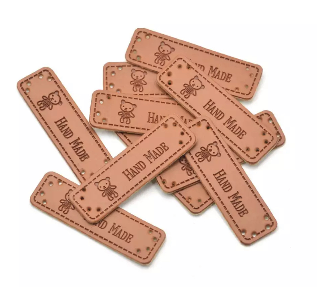 Imitert skinn lapp med tekst «hand made» og en bamse. 5cm x 1,5cm.