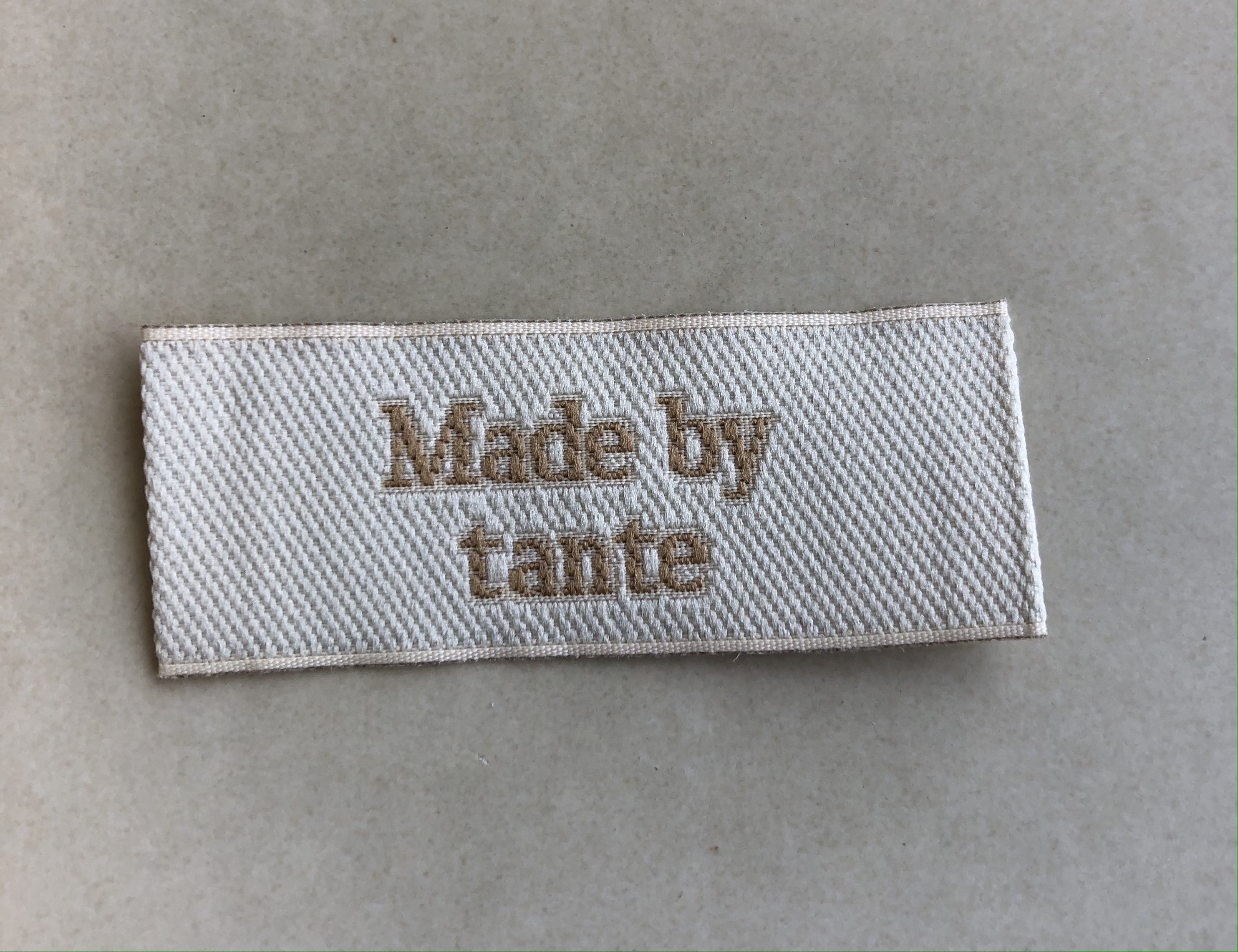 Merkelapp til å sy på plaggene , med tekst " made by tante " .