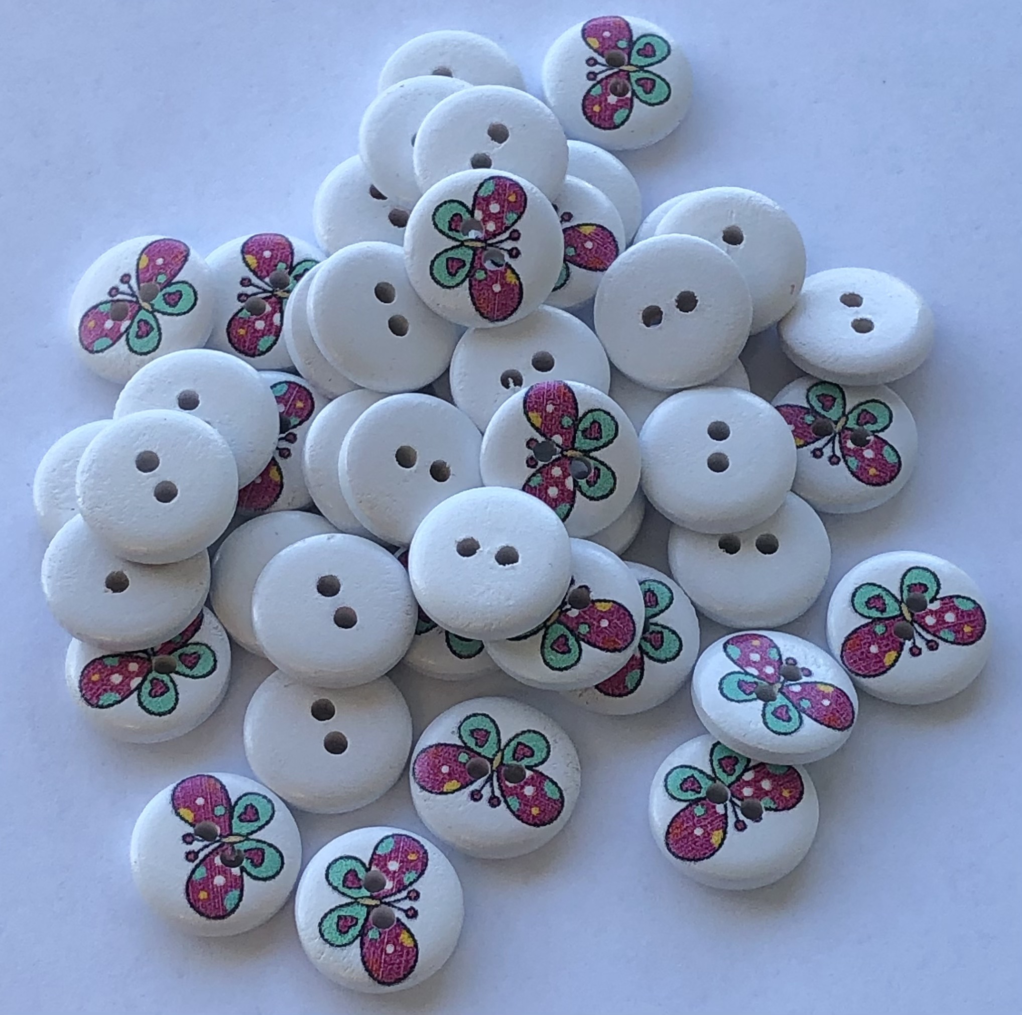 Hvit tre knapp med sommerfugl , 15mm.