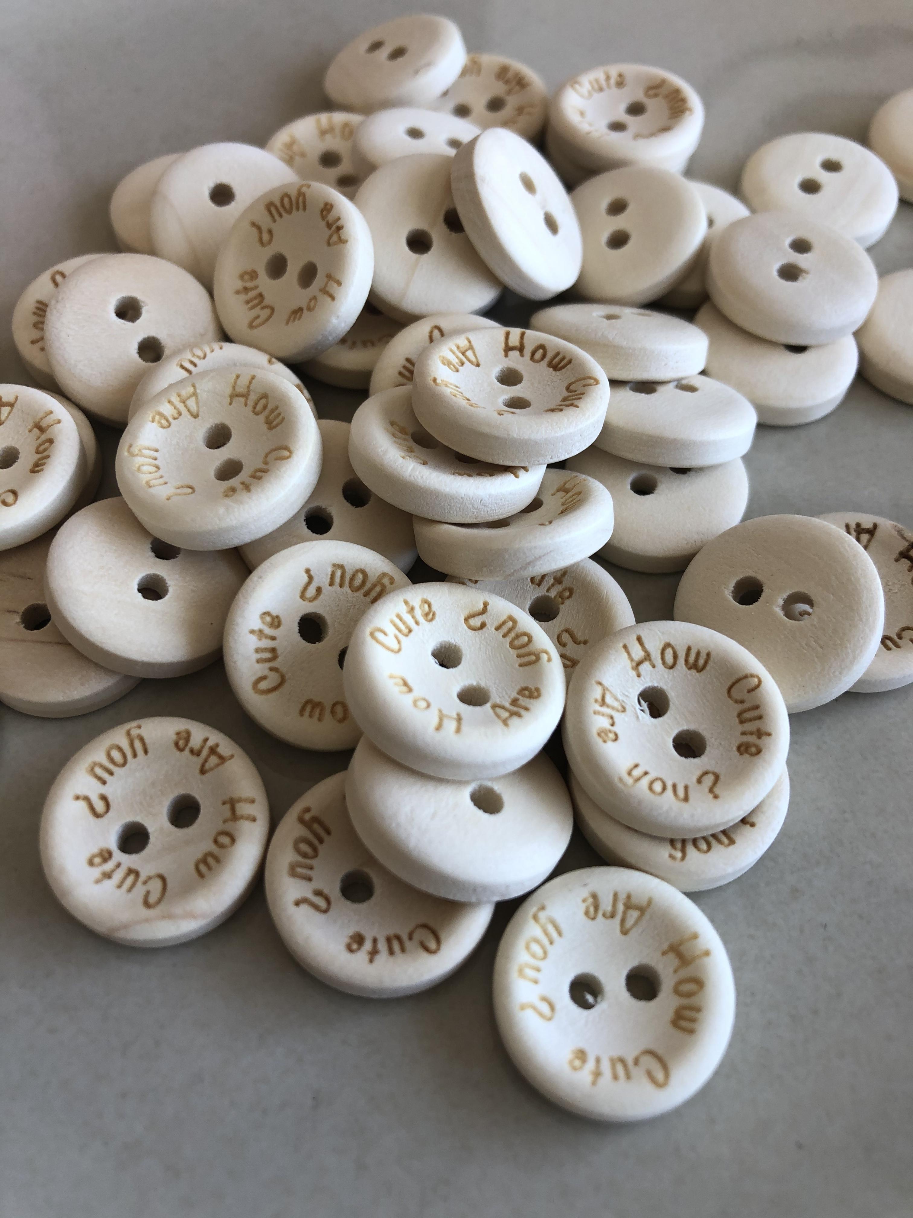 Tre knapp med tekst « how cute are you?» ,15mm.