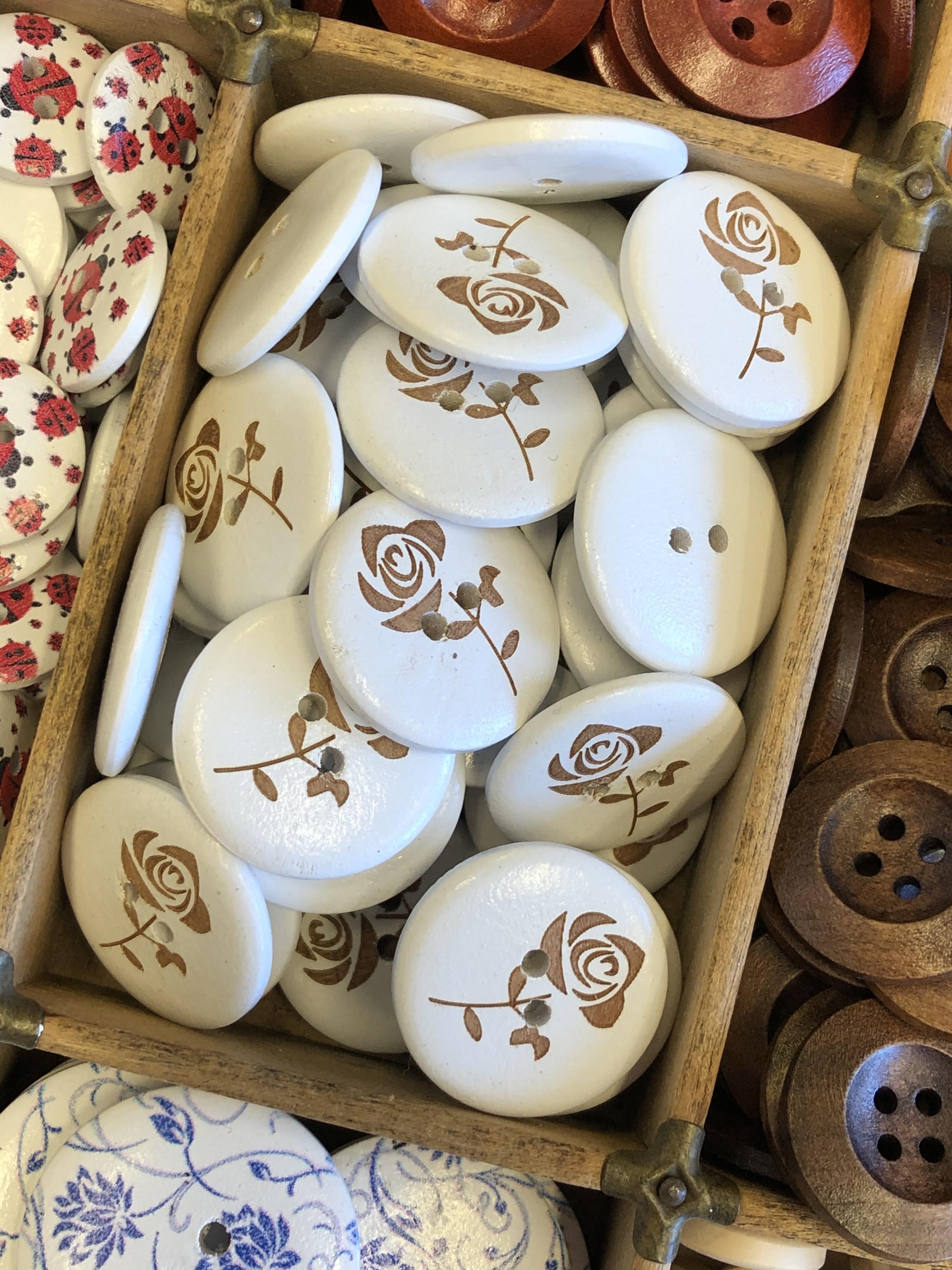 Hvit tre knapp med blomst , 25mm.