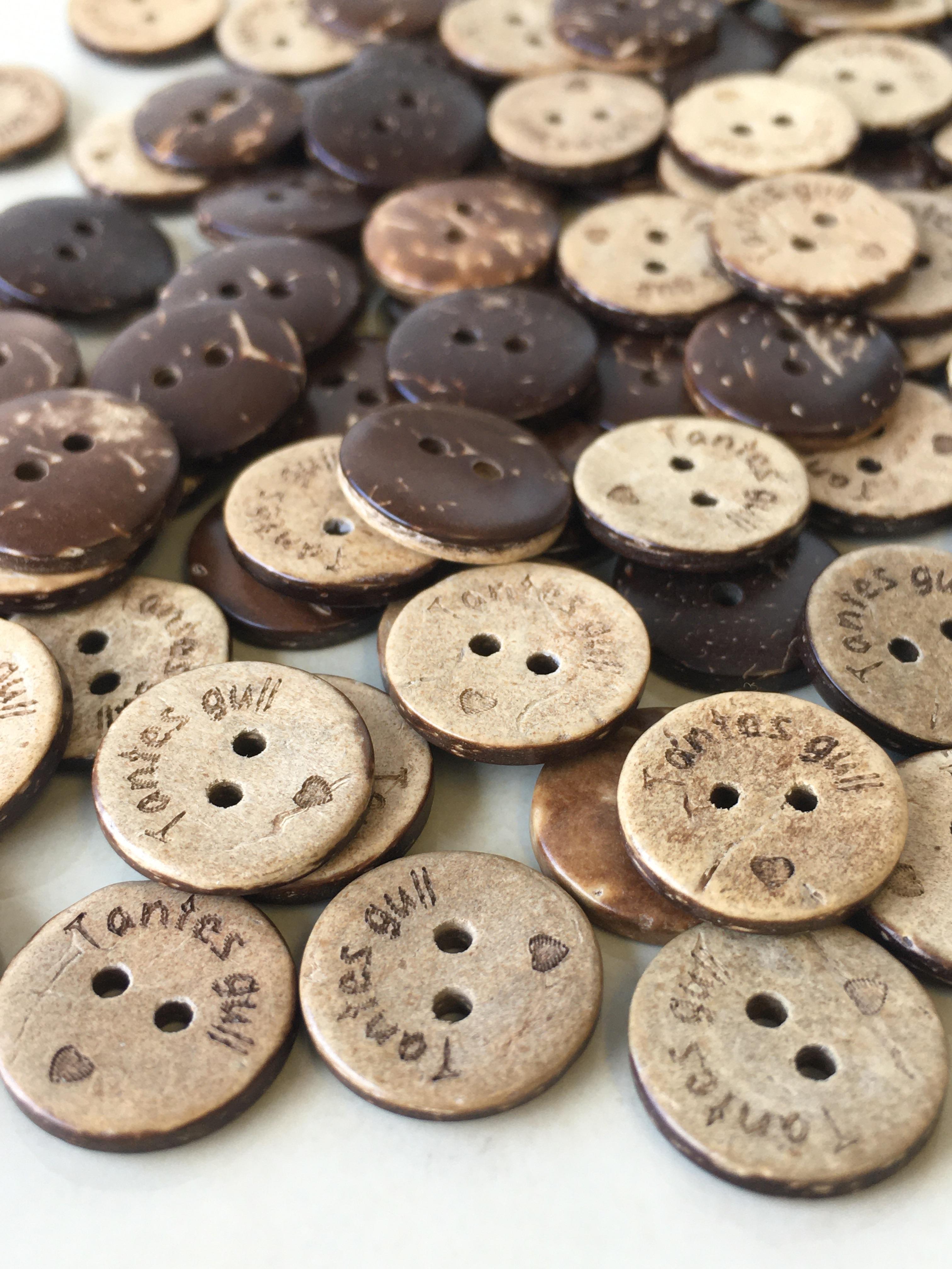 Garnpikens eget designet kokos knapper med tekst « Tantes gull» , 15mm.