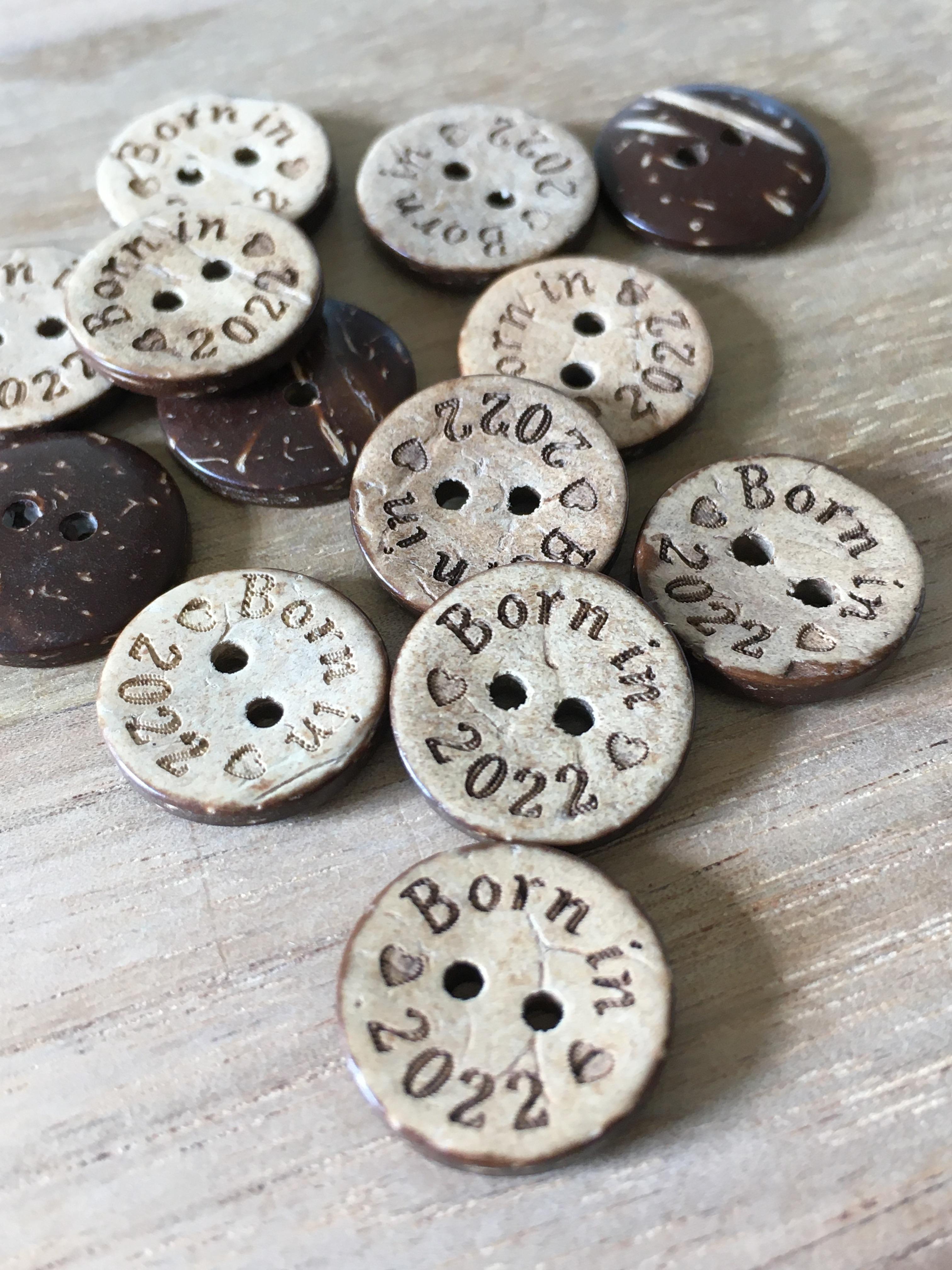 Kokos knapp med tekst « Born in 2022» , 15mm.