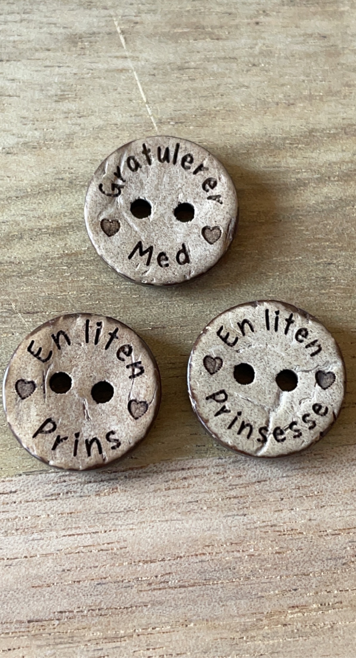 Kokos knapp med koselig tekst, sett personlig preg på barselstrikk gaven.