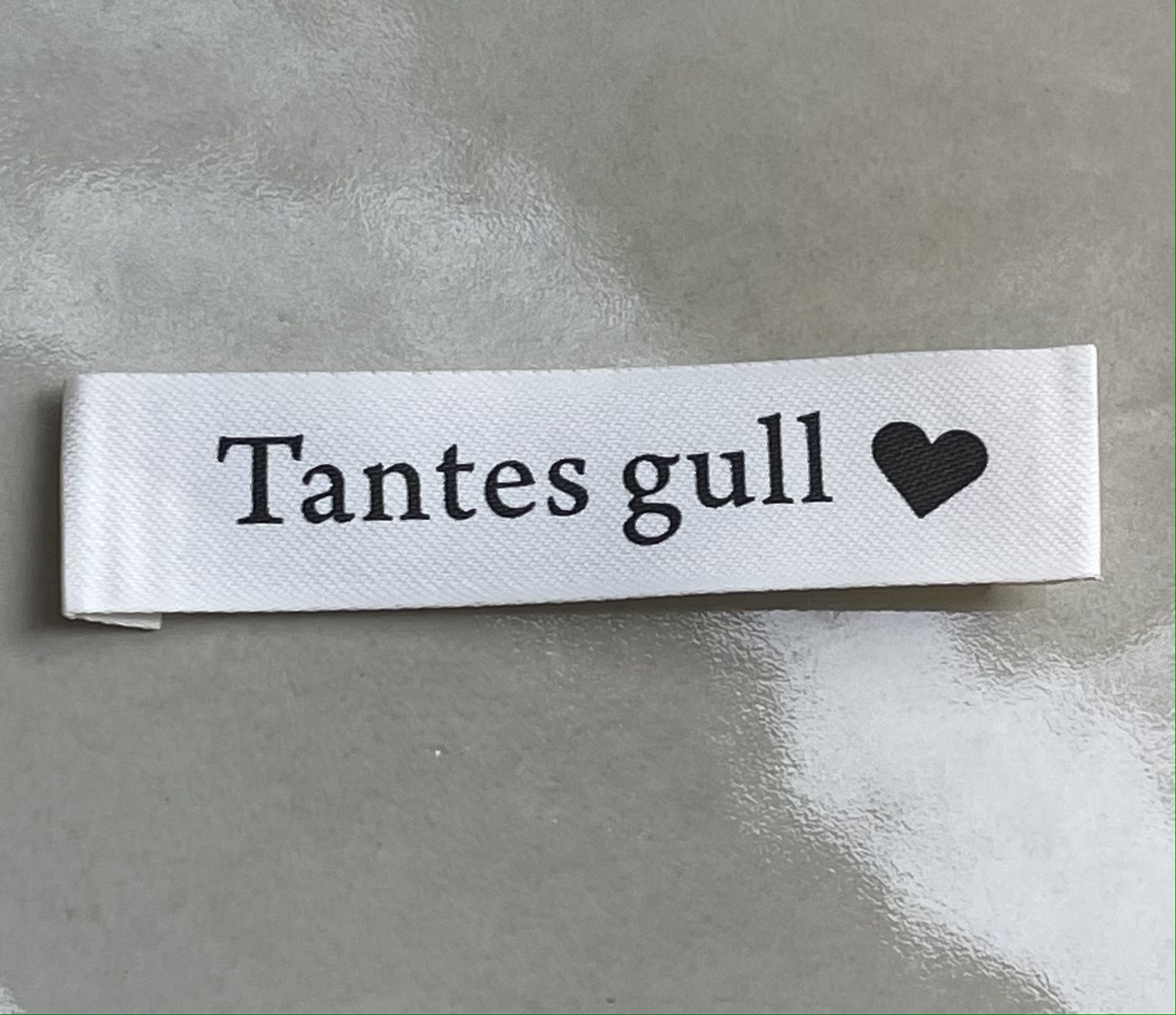 Lapp med tekst " Tantes gull " , 15 x 60mm.