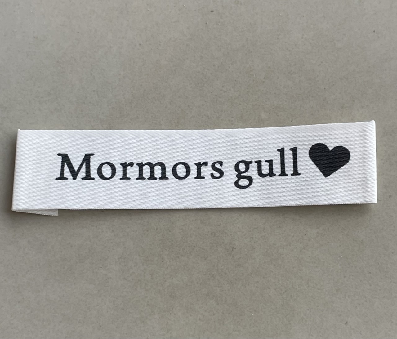 Garnpikens eget designet lapper med koselig tekst " Mormors gull"