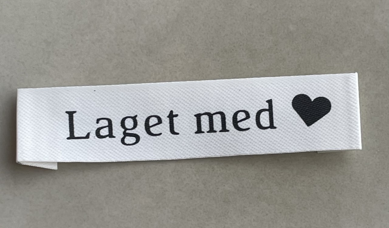 Garnpikens eget designet lapper med koselig tekst " Laget med <3 "