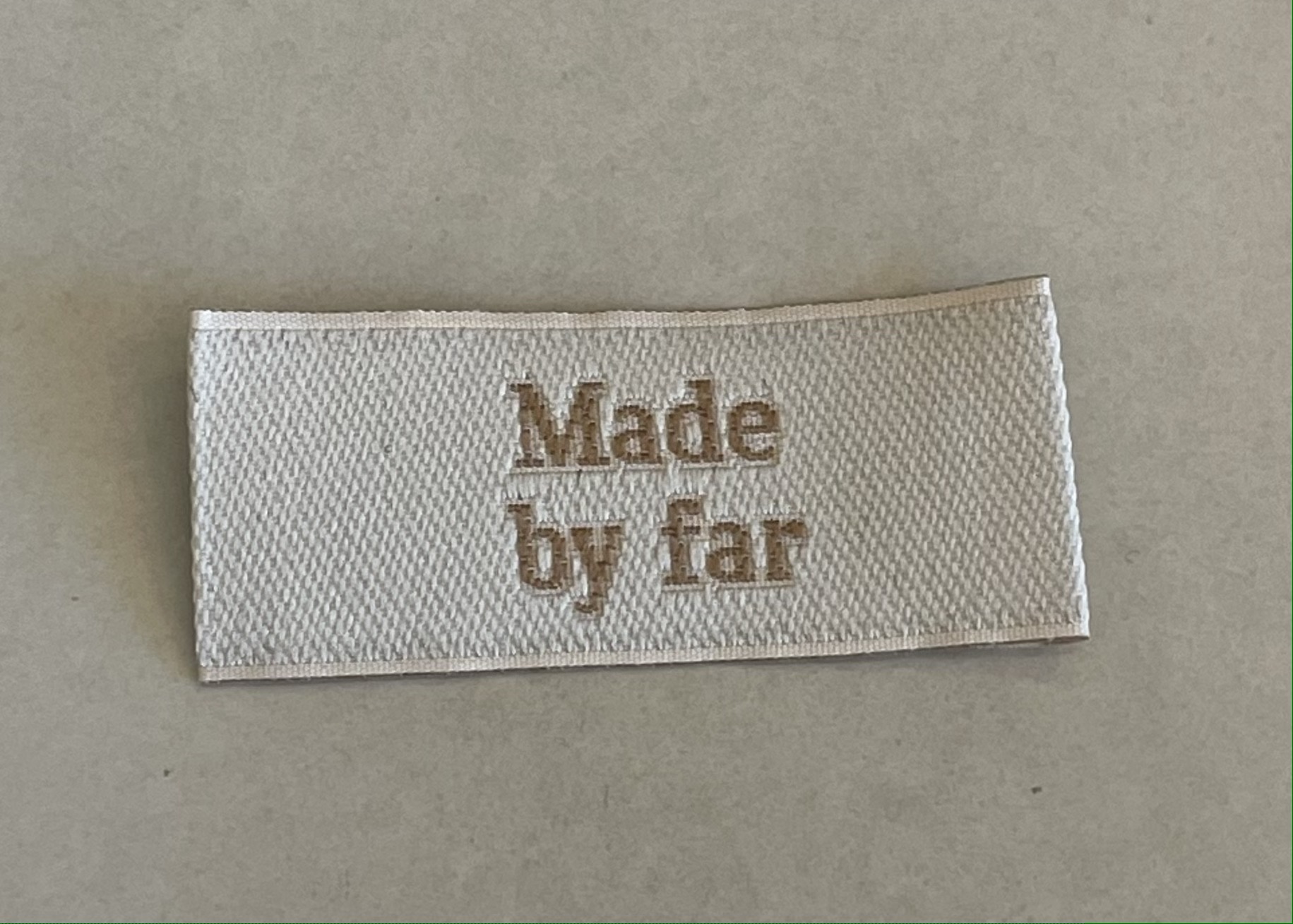 Merkelapp til å sy på plaggene , med tekst " Made by far " .