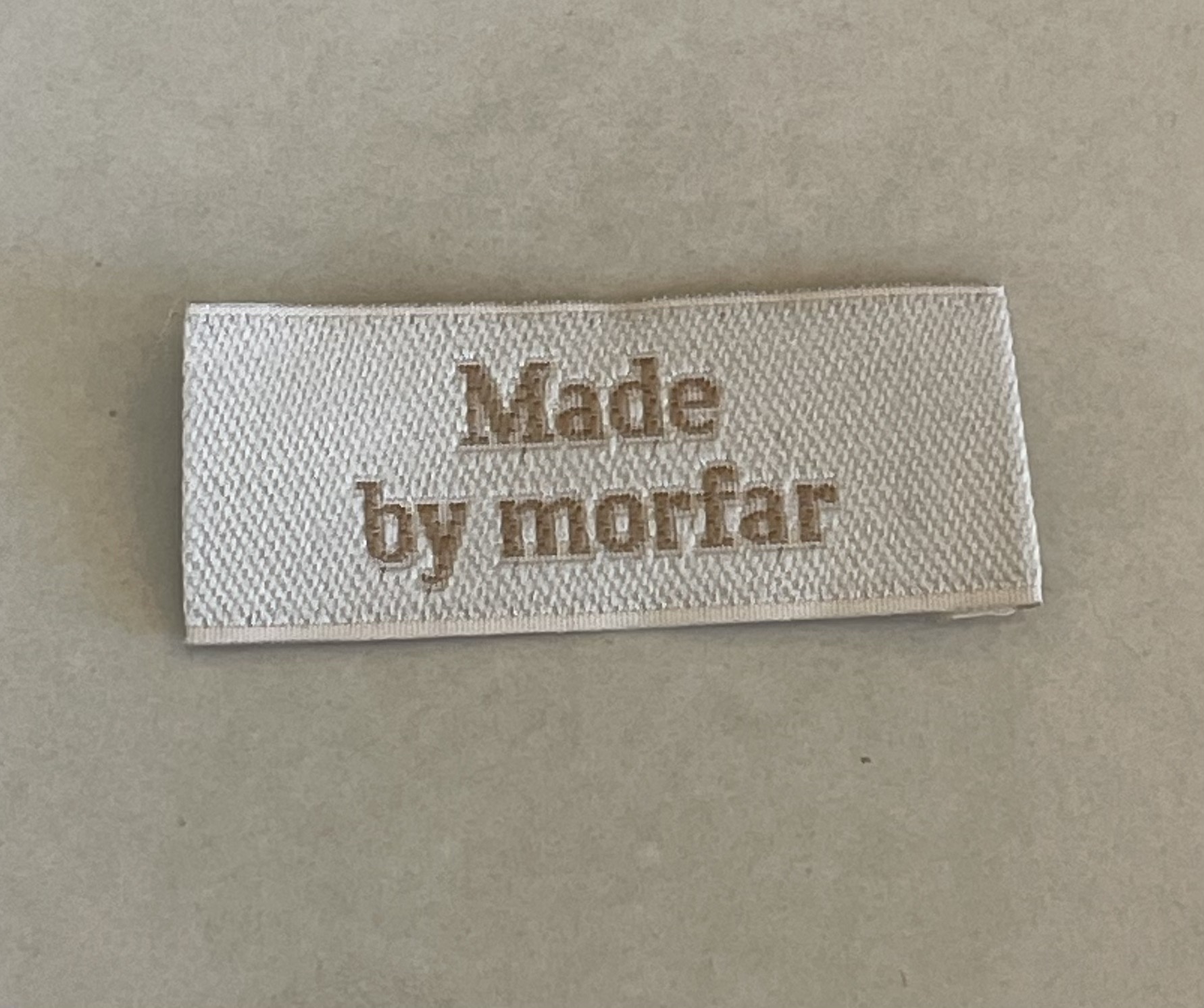 Merkelapp til å sy på plaggene , med tekst " Made by morfar " .
