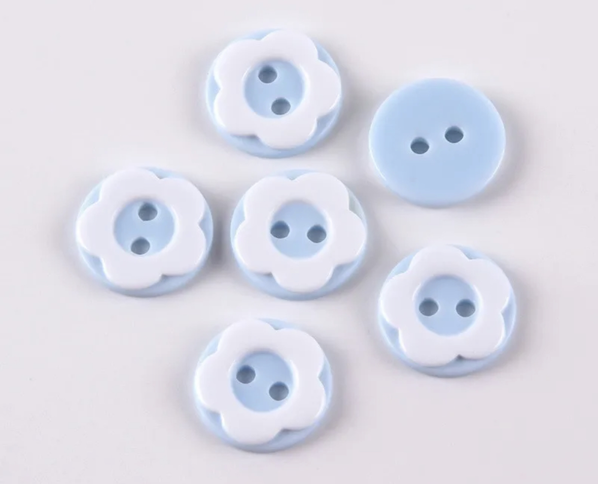 Knapp med blomst i lyseblått og hvit , 13mm.