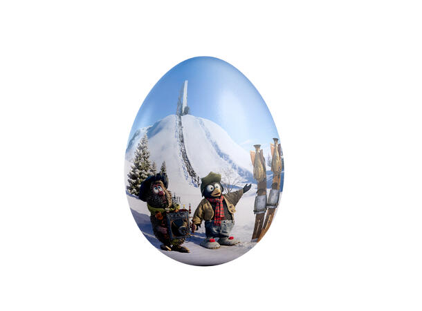 Flåklypa påskeegg som er laget i tinn med motiv fra "Rekorden". Kan tas frem år etter år. Det er og nydelig som dekor. Kan åpnes og legges godteri i! Håndvask, tørkes grundig.