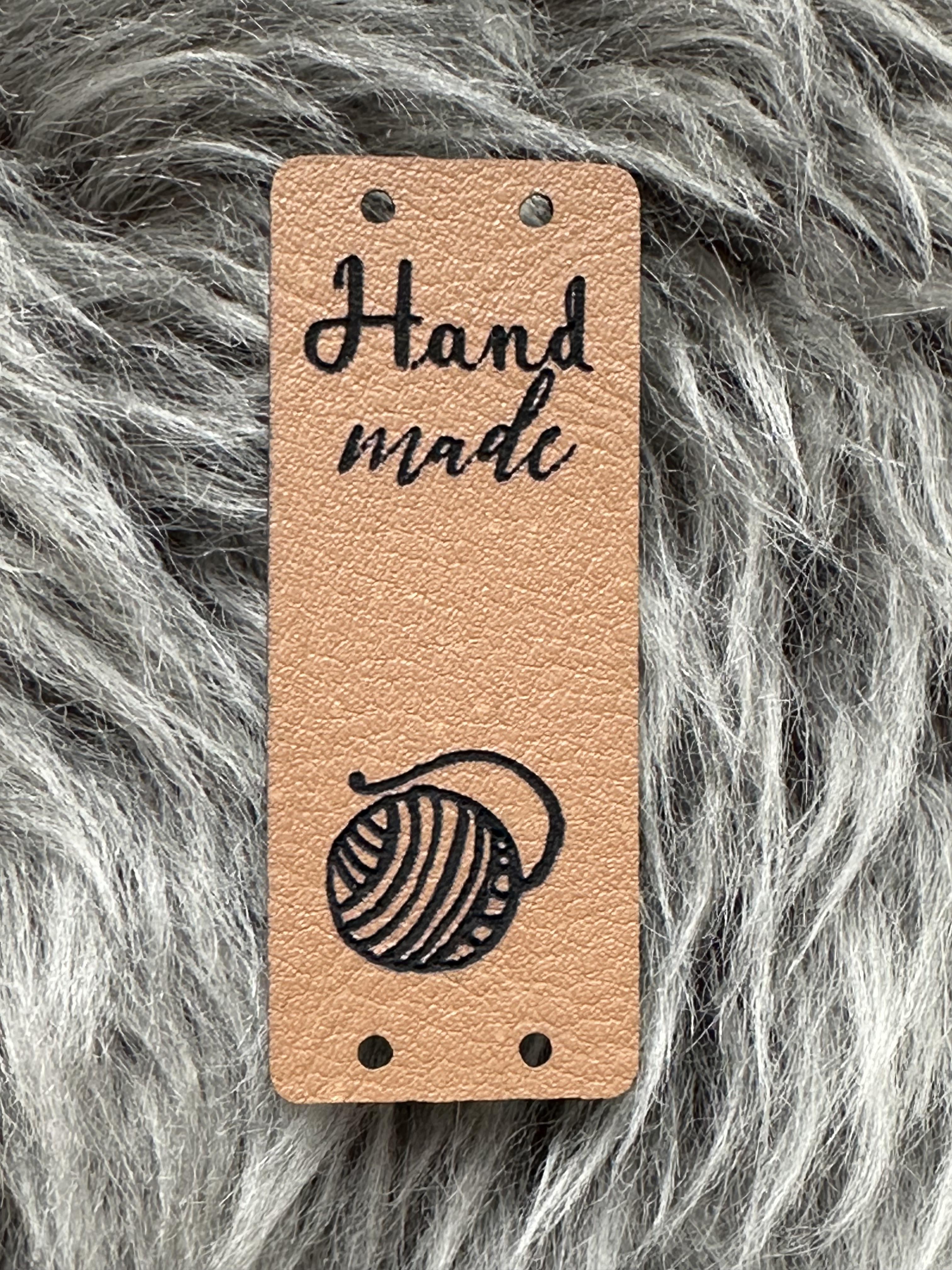 Merkelapp til å si på plaggene , med tekst hand made og et nøste.