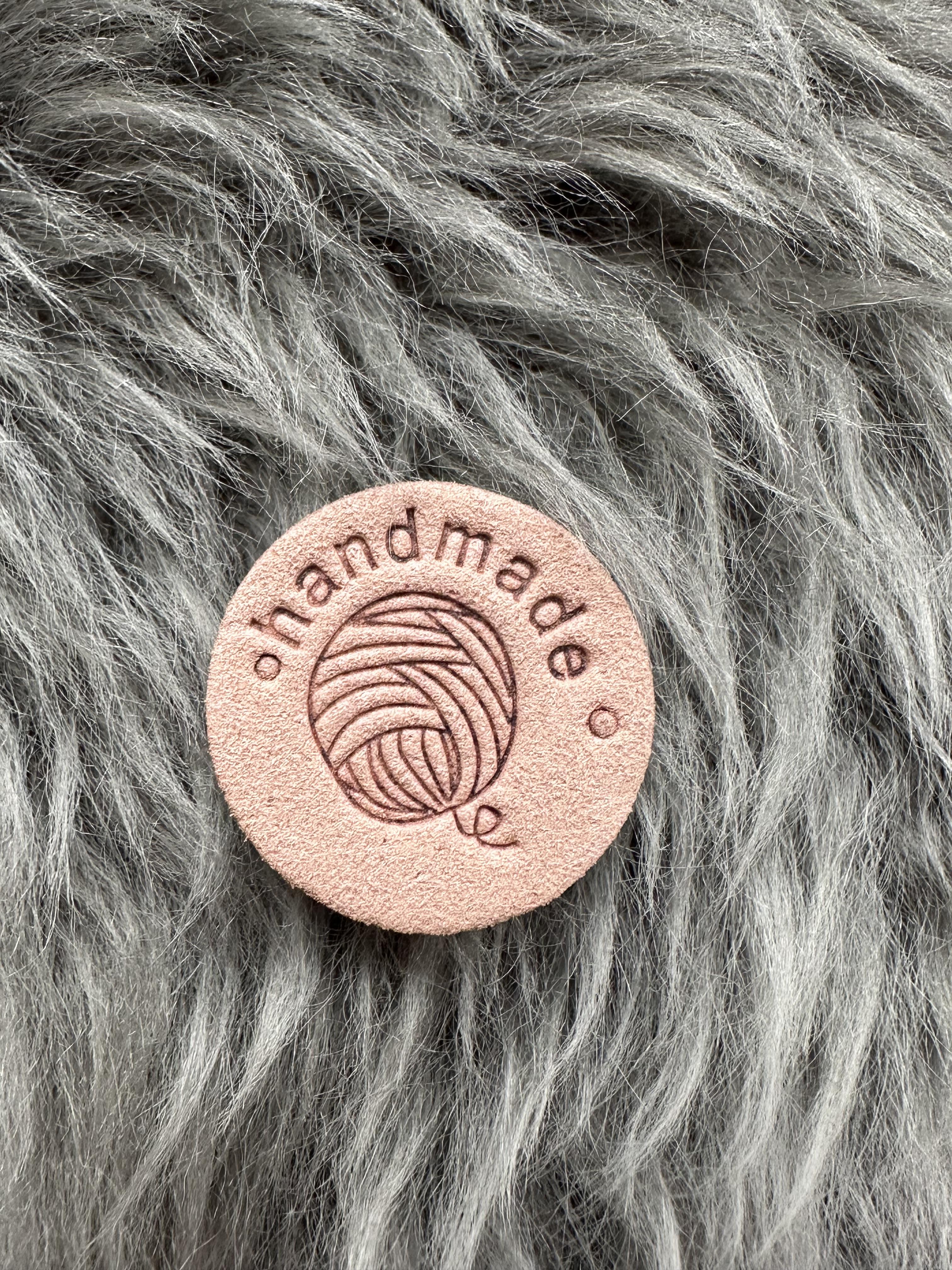 Merkelapp til å sy på plaggene , rund med tekst hand made.