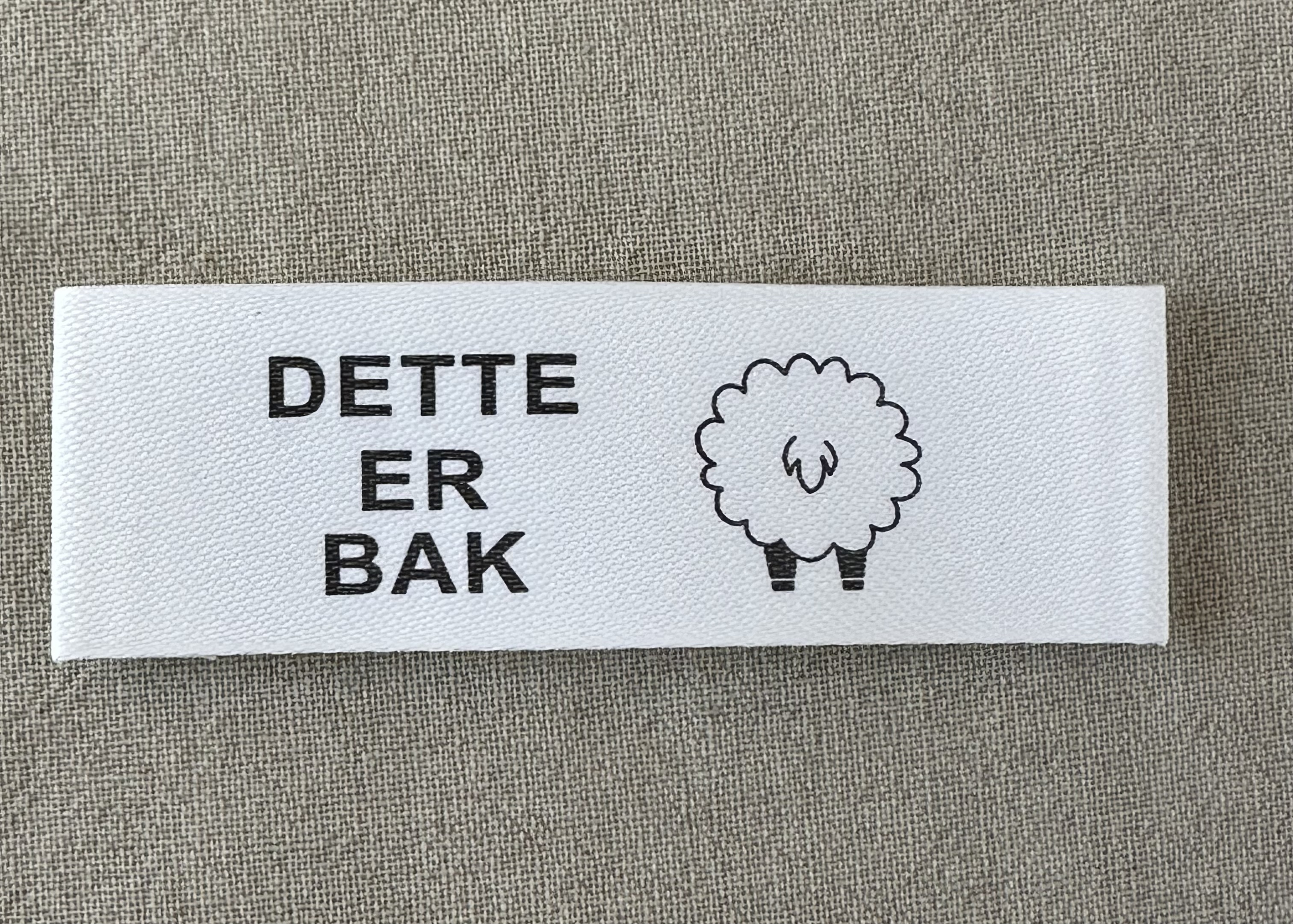 Lapp til å si i strikka gensere, for å vise hva som er bak. Med tekst « Dette er bak» og en sau.